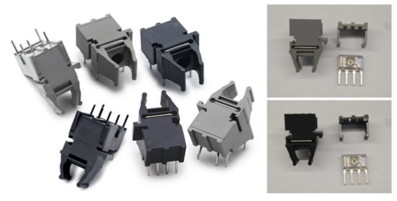塑料光模块一般有卧式(Horizontal Module)、立式(Vertical Module),斜30°(Tilted (30°)Module)三种封装形式。如图1所示,其内部结构简单,发光LED或接收芯片通过透明材质塑封后组装进外壳即可使用。塑料光模块通常具有很大的数值孔径NA=0.5,数值孔径是一个无量纲的数,它定义了光纤接收或传播光线的最大角度范围,任何入射角小于该角度的光线都能被光纤捕捉并通过全反射在内部传输,其公式如下: