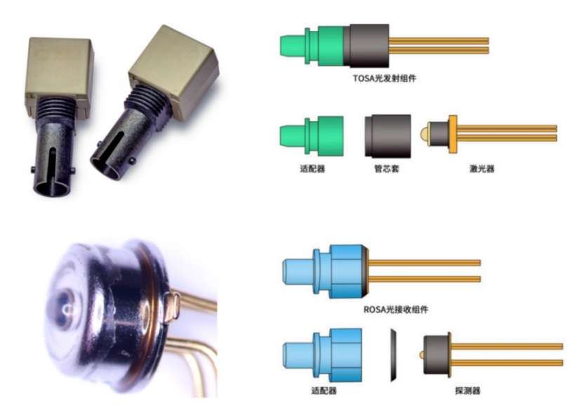 ST光模块收发端分别有各自核心组件,即光发射组件TOSA(Transmitter Optical Subassembly)和光接收组件ROSA(Receiver Optical Subassembly)。TOSA主要由适配器、管芯套以及激光器(实物见图2左下图片)组成,在其光输出端加上适当的外壳即可组成各类标准接口的光模块,同理ROSA亦是如此,只是ROSA比TOSA少一个管芯套。激光器以及探测器其实都是一个密封器件,内部填充惰性气体,并会进行气密性检测,所以ST光模块的潮敏等级理论上是高于塑料光模块,其等级可达MSL1,但除个别新品器件大部分规格书并未给出相关信息。光模块在系统中是一个很关键的器件,直接影响信号的传输质量,需要根据规格书要求进行存储保存。