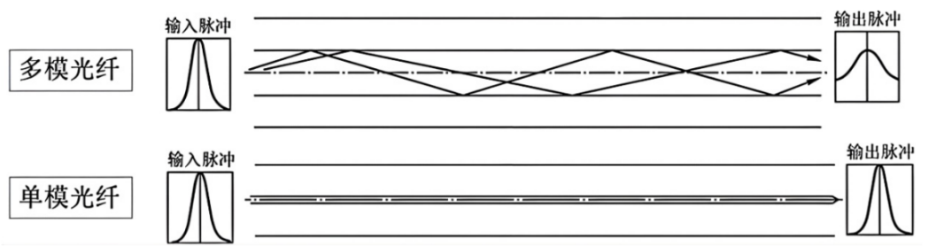 光纤分为单模光纤(Single-mode Fiber,SMF)和多模光纤(Multi-mode Fiber,MMF),主要也是基于模态色散的影响考虑,单模光纤的光源一般为定向性很好的激光光源,主要传输一种模态的光,信号完整性好,可进行几十公里的远距离传输,且单模光纤的光波长一般为1310㎚和1550㎚;但多模光纤的光源一般为LED,传输多种模态的光,由于色散的影响,只能进行1-3公里的中长距离传输,塑料光纤甚至只能传输百米以内。