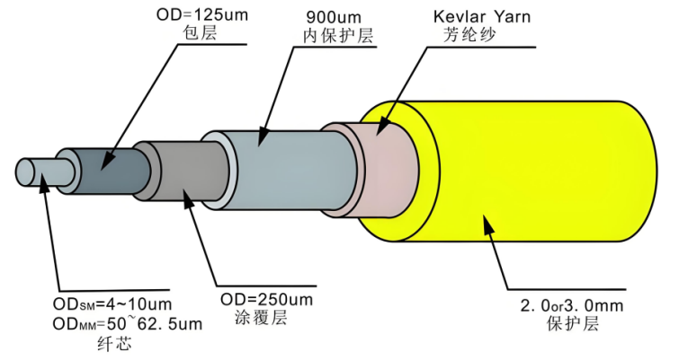 图4是光纤线的整体结构图,其单模光纤和多模光纤的纤芯直径是不一样的,单模光纤的纤芯直径小于多模光纤,主要是为了避免模态色散影响,单模光纤的纤芯直径一般为4-10㎛,多模光纤的纤芯直径一般为50-62.5㎛,包层直径一般为125㎛,所以光模块规格书都会给出适配的光纤类型,如50/125㎛或60/125㎛的多模光纤,本文介绍的塑料光模块和ST光模块都是采用的多模光纤。