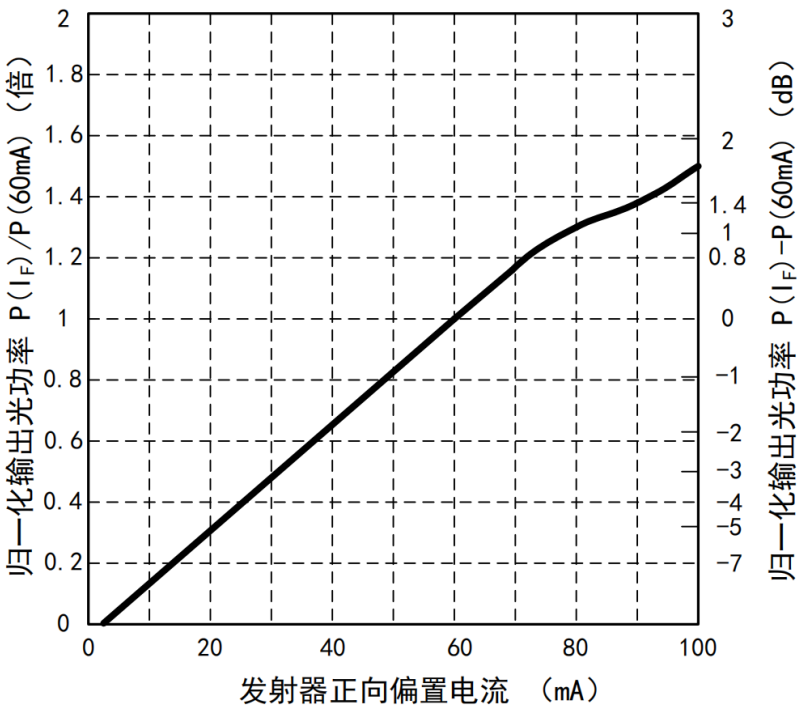 假设发送光模块的驱动电流为30mA,且其在60mA下的发送光功率典型值为-14dBm,其正向导通电流与归一化输出光功率曲线图如图6所示,接收光模块的接收灵敏度最大值为-35dBm,采用62.5/125㎛多模光纤