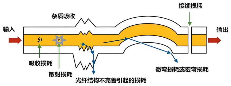 这里我们需要介绍下光纤损耗,由于材料纯度、连接方式等都不能达到绝对的理想状态,必然会产生光强衰减。首先,光纤材料和杂质本身会吸收光能,把部分光能转化为热能;其次,材料不可能做得绝对的纯度,材料纯度不够折射率就会不均匀,引起散射;此外,光纤结构也不可能做得绝对规整,且光纤的连接、弯曲等都会引起损耗。