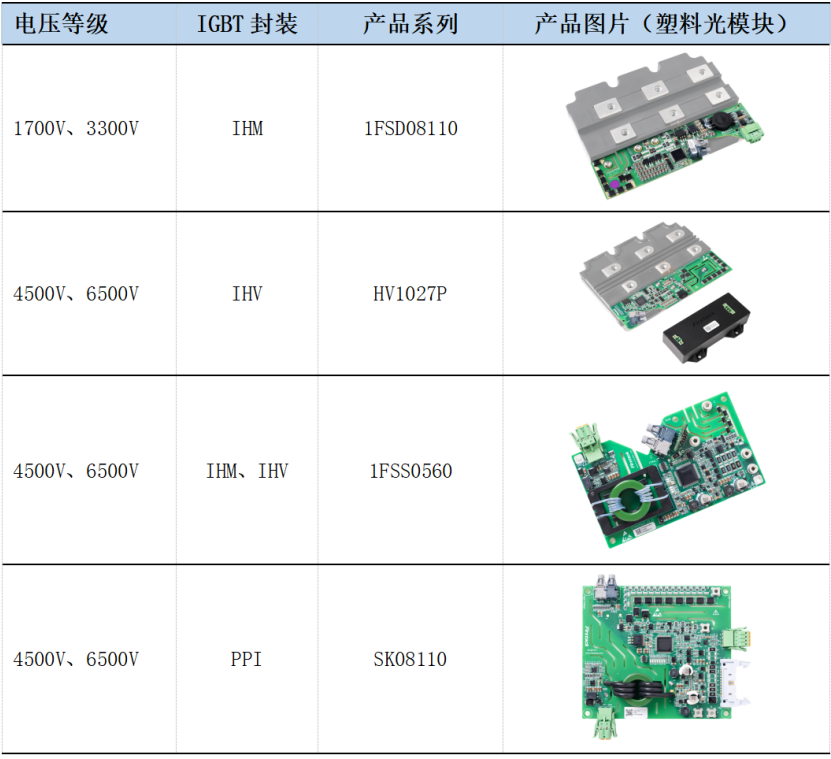 在高压大功率变流器应用场景,如轨道交通变流器,MW级大功率变频器,MW级船舶推进,高压SVG,HVDC换流阀等,会用到3300V、4500V以及6500V的IGBT模块,需要采用基于光模块的IGBT驱动产品。