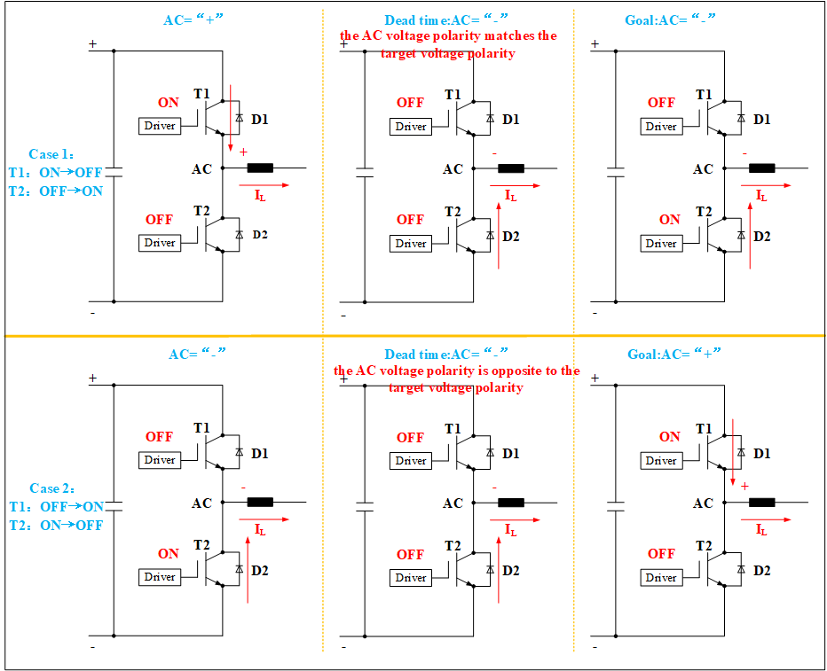 Case 1: T1 switches from on to off, and after a short dead time, T2 switches from off to on.During the effective dead time, both switches are off,and the freewheeling diode D2 conducts the output current. At this time, a negative DC voltage is applied to the AC output terminal. When T2 is fully turned on, the AC output ultimately delivers negative DC voltage through T2. Therefore, during the dead time, the AC voltage polarity matches the target voltage polarity, which complies with the design requirements.