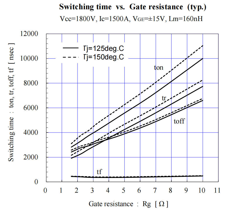 As shown in Figure 5 (from Fuji’s 1MBI1500UE-330 datasheet), gate resistance significantly affects IGBT turn-on/turn-off delays.Turn-on and turn-off delays increase as gate resistance increases, necessitating testing under actual gate resistance conditions. The diagram also reveals that IGBT junction temperature impacts delays—higher temperatures result in longer delays. The 1.2 safety factor accounts for junction temperature effects, but for high-voltage modules rated 3300V and above, this coefficient is typically set to 1.5.