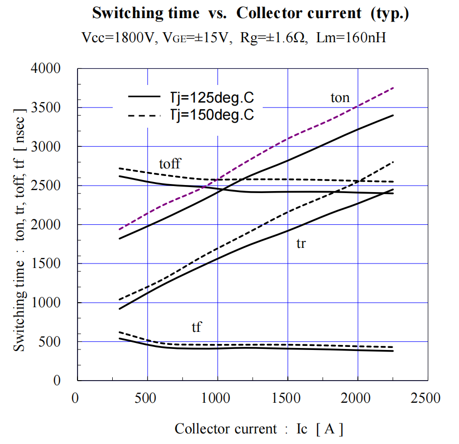As shown in Figure 6 (from Fuji’s 1MBI1500UE-330 datasheet), we observe that as the collector current decreases, the turn-off delay increases while the turn-on delay decreases. Therefore, under constant bus voltage, smaller collector currents impose stricter requirements on dead time. Consequently,measuring turn-on/turn-off delays under specific driving conditions and then calculating dead time based on the measured values is a better and more precise method. We typically advise customers that measuring turn-on/turn-off delays at rated bus voltage and 10% of the IGBT's rated collector current suffices to calculate the required dead time.