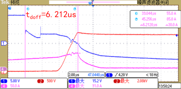 Dead time can effectively prevent arm shoot-through short circuits. However, excessive dead time affects system stability. Meanwhile, gate resistance significantly impacts IGBT turn-on/turn-off delays, and smaller collector currents impose stricter requirements on dead time. Therefore, it is necessary to test turn-on/turn-off delays under specific driving conditions to accurately evaluate dead time.