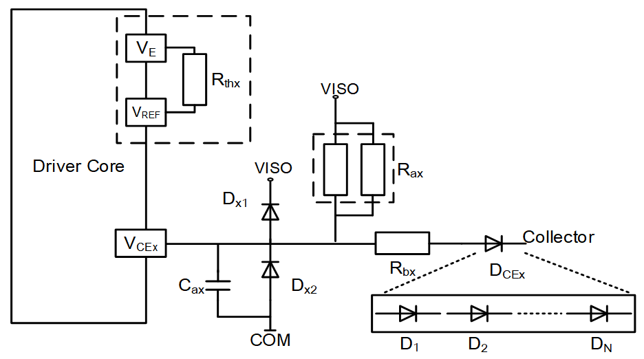 Should the IGBT desaturate due to a short circuit, the VCE rises rapidly, the high-voltage diode DCEx turns off, VISO charges Cax. When the Cax potential reaches the detection threshold (set via the REF pin; refer to the product application manual for configuration), the internal ASIC comparator activates, triggering the soft-off MOS to turn off the IGBT.