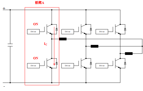 下图为一个典型三相半桥拓扑图。正常运行时,每相桥臂的两个IGBT会交替导通与关断。当某相桥臂的两个IGBT器件同时导通,即发生所谓的“桥臂直通”现象时,将导致该相电流急剧上升,其上升速率仅受直流母线电压以及回路杂散电感限制。