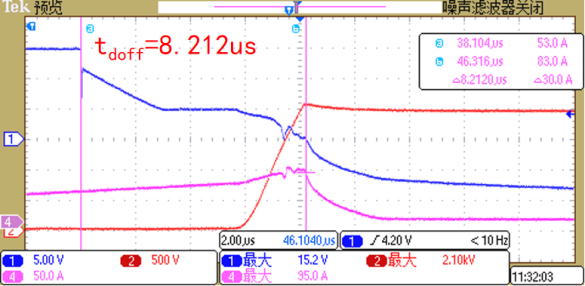 图9为飞仕得采用HV1027P驱动器匹配英飞凌FZ1200R45KL3_B5模块在VDC=2000V,IC=100A下的关断延时对比图。由图可知,不带分级关断功能的关断延时为8.212us,带分级关断功能的关断延时为6.212us,关断延时减少近25%,真实有效地减小了死区时间,提高系统运行稳定性。