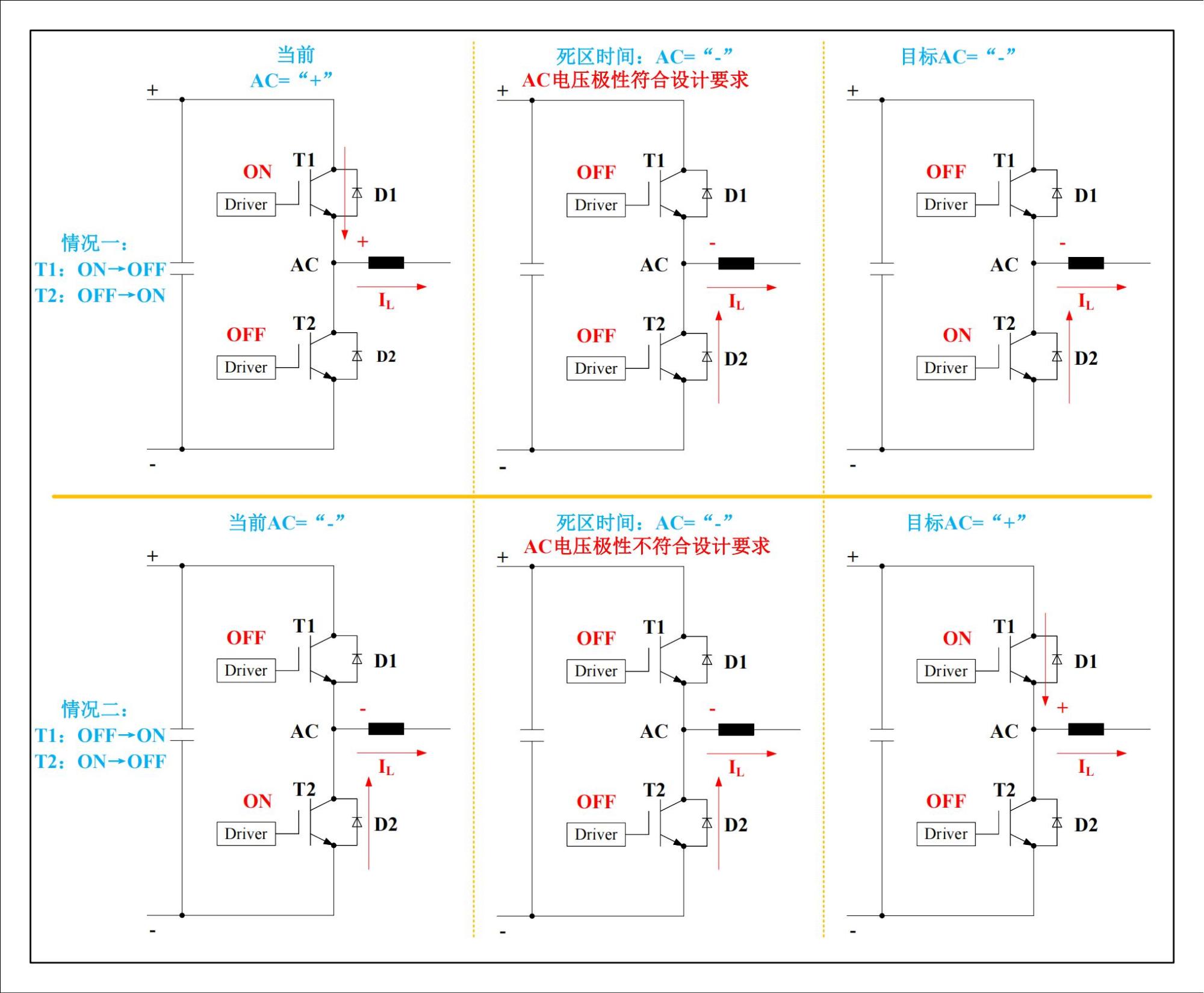 如图2所示,首先假设输出电流按图示方向流动,情况一:T1由开通到关断,经过一小段死区时间后T2由关断到开通。在有效死区时间内,两个开关管都是关断的,且续流二极管D2流过输出电流,此时负的直流电压加在输出侧AC。而当T2完全开通时,AC最终通过T2管输出负的直流电压。所以在死区时间内AC电压极性与目标电压极性是一致的,符合设计要求。情况二:T1由关断到开通,而T2由开通到关断,此时由于电流还是沿着同一个方向,这一电流在死区时间依然流过,因此AC输出电压还是为负值。但是最终AC由于T1管开通输出正的直流电压,所以在死区时间内,AC电压极性与目标电压极性相反,不符合设计要求。所以结论可以总结如下:在有效的死区时间里,AC输出电压由输出电流方向决定,而非控制信号。