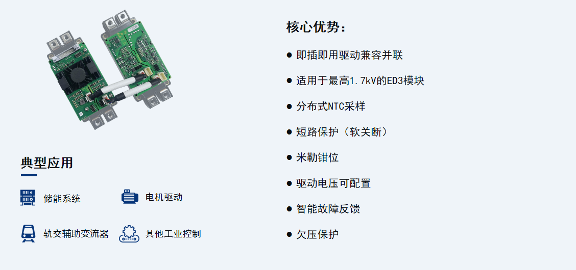 2FHD0620:支持单管和并联的即插即用驱动。适配最高1700V的ED3封装模块,可以支持大功率高电压系统: