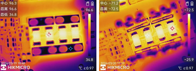图7 23kHz:无散热装置(左);有散热装置(右)