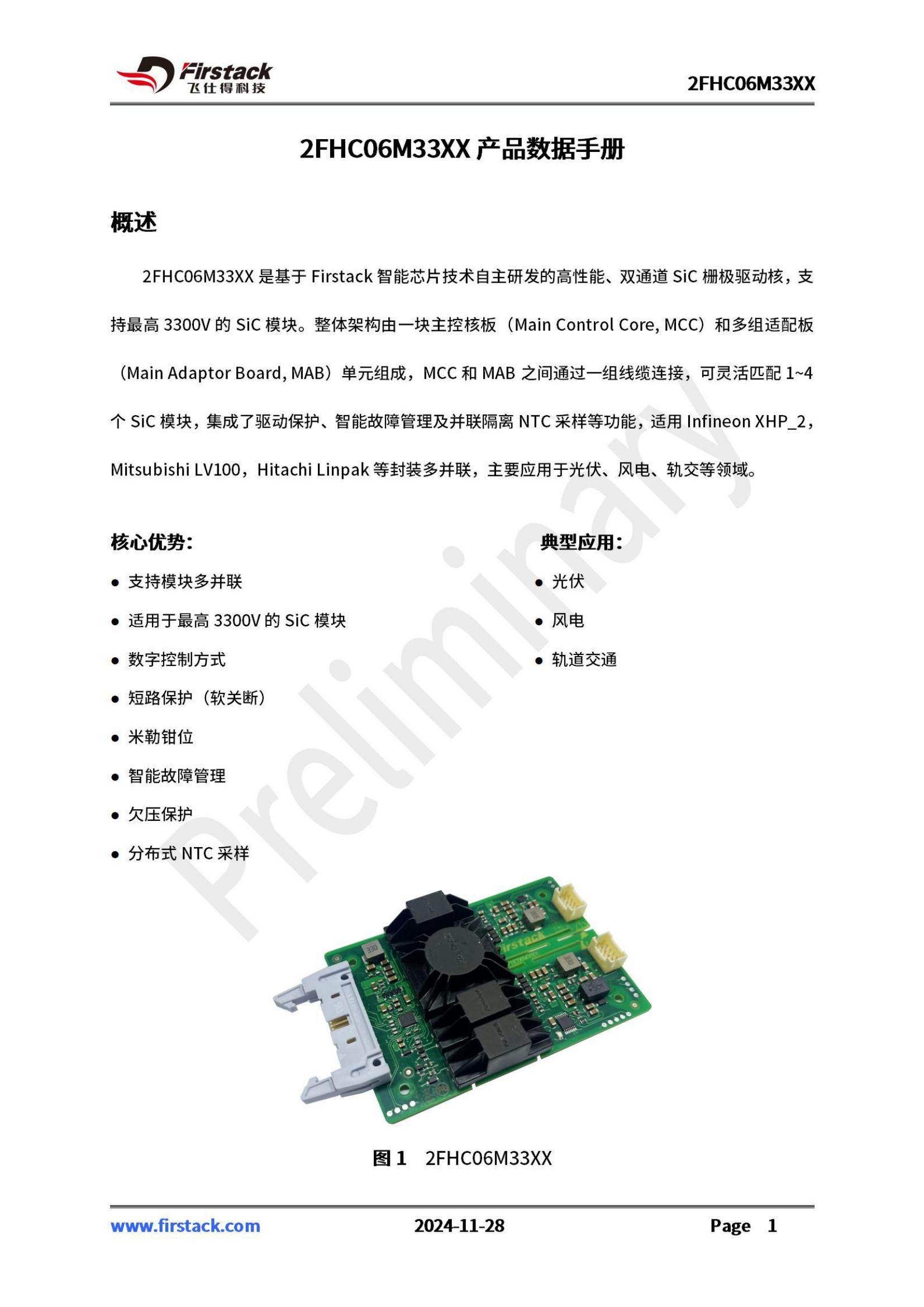 2FHC06M33XX是基于Firstack 智能芯片技术自主研发的高性能、双通道SiC/IGBT 栅极驱动核,支持最高 3300V 的 SiC模块。整体架构由一块 MCC(绝缘主控板)和多组 MAB(模块适配栅极驱动板)单元组成,MCC和MAB之间通过一组线缆连接,可灵活匹配1~4个SiC/GBT模块,适用InfineonXHP2,MitsubishiLV100,Hitachi Linpak 等封装多并联,主要应用于光伏、风电、轨交等领域。