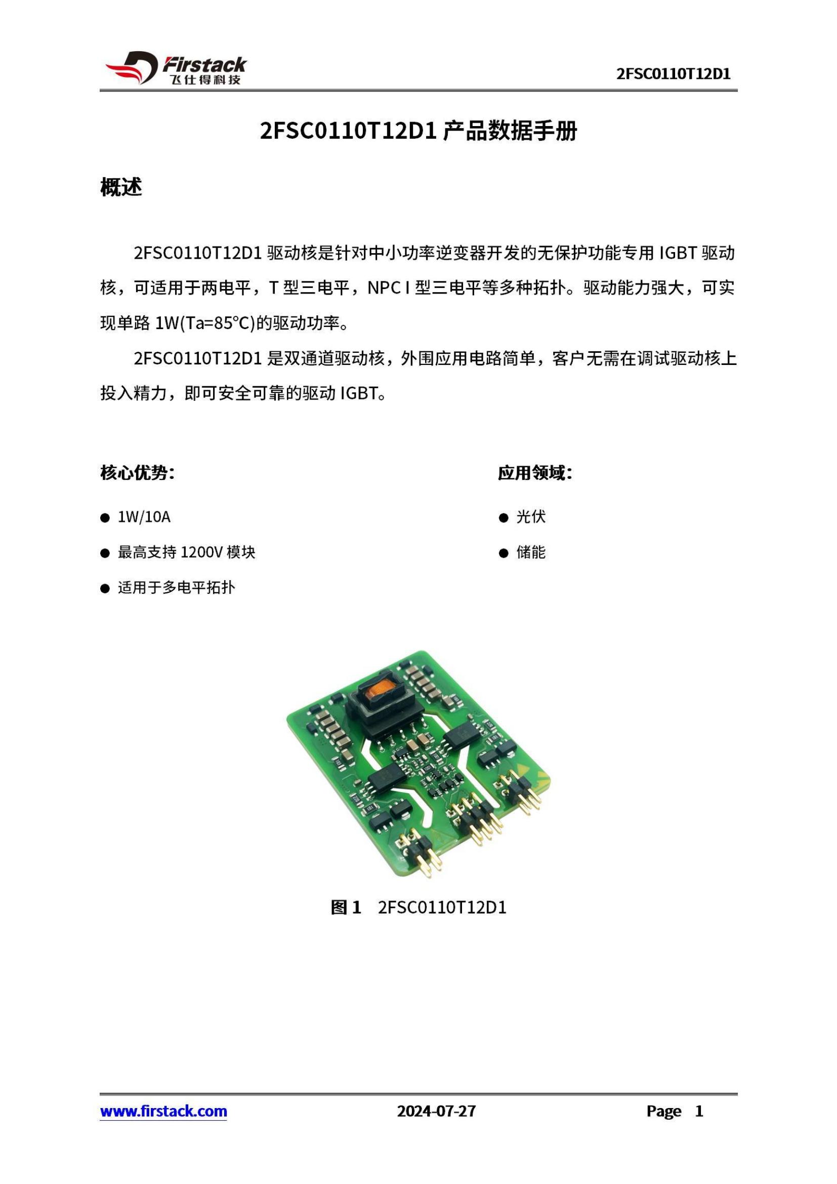 2FSC0110T12D1驱动核是针对中小功率逆变器开发的无保护功能专用IGBT驱动核,可适用于两电平,T型三电平,NPC I型三电平等多种拓扑。驱动能力强大,可实现单路 1W (Ta=85°C) 的驱动功率。
