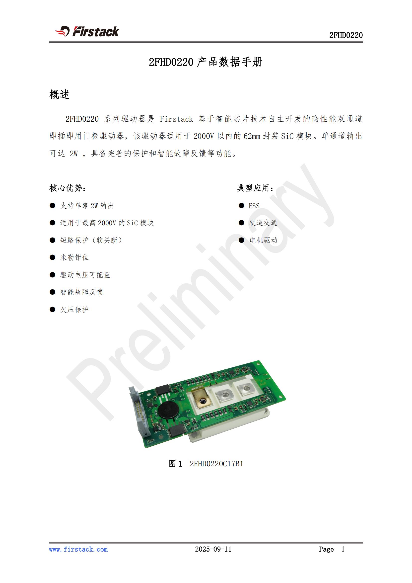 2FHD0220 系列驱动器是 Firstack 基于智能芯片技术自主开发的高性能双通道即插即用门极驱动器,该驱动器适用于 2000V 以内的 62mm 封装 SiC 模块。单通道输出可达 2W ,具备完善的保护和智能故障反馈等功能。