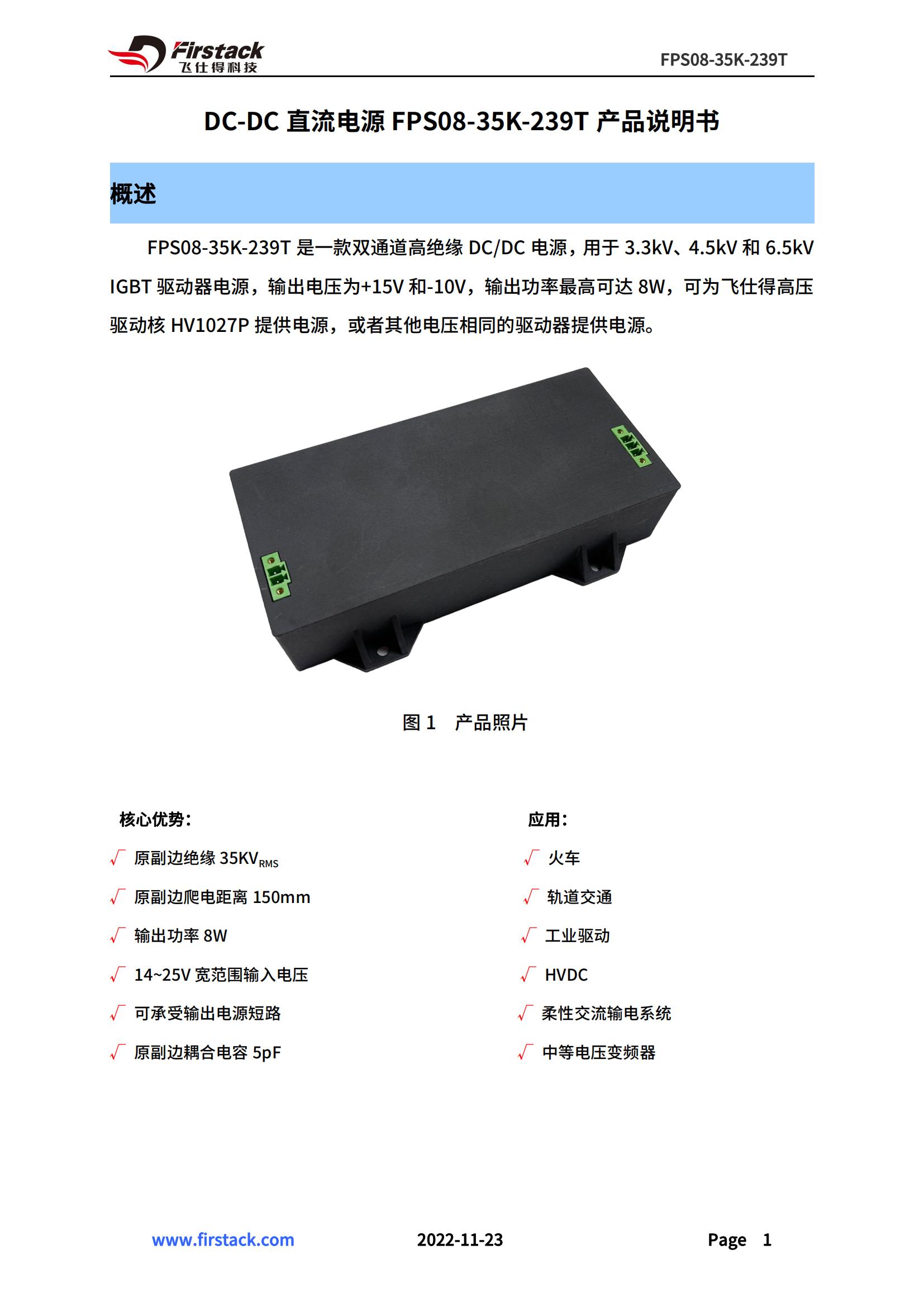 FPS08-35K 是一款双通道高绝缘DC/DC电源,用于3.3kV、4.5kV和 6.5kVIGBT驱动器电源,输出电压为+15V和-10V,输出功率最高可达 8W,可为飞仕得高压驱动核 HV1027P 提供电源,或者其他电压相同的驱动器提供电源。